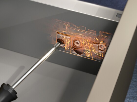 Every MERIVOBOX option can be assembled quickly and easily thanks to the consistent platform concept. The drawer back and bottom are the same width, making it easy to streamline the manufacturing process. MERIVOBOX also has simple, clearly labeled and easily accessible 3-dimensional adjustment features which are the same for every drawer side.