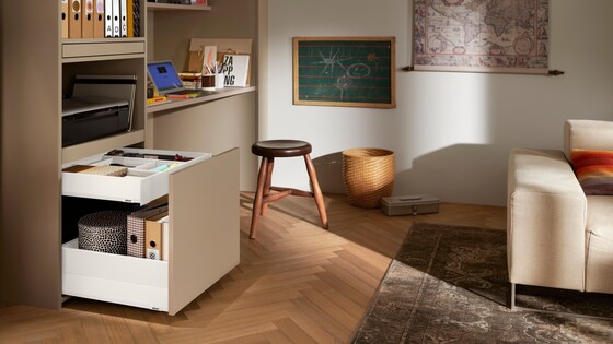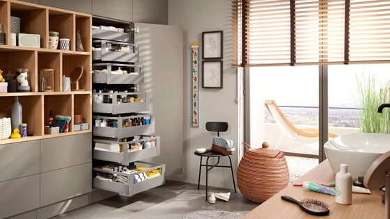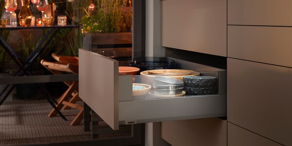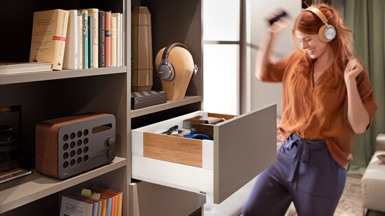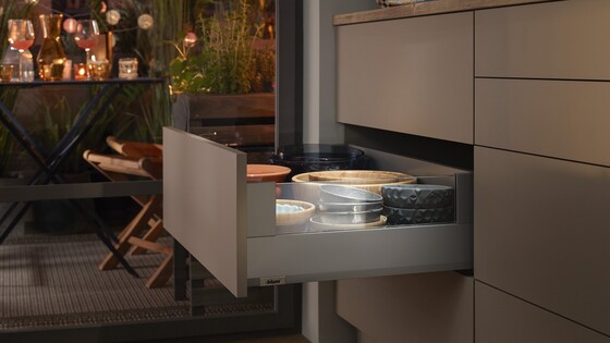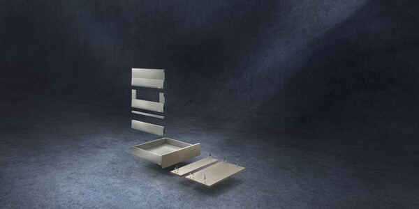The three components – cabinet profile, drawer side and front – allow for variety with the same manufacturing process. MERIVOBOX is the true platform for your broad range.