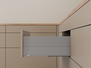 The innovative L-shape of the cabinet profile makes MERIVOBOX incredibly stable even when fully loaded. The new box system not only has a synchronized feather-light glide but also boasts high front stability, opening up new possibilities for kitchen design. High fronts can be easily combined with low drawer sides for a unique look.