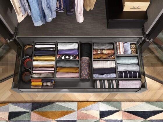 The elegant frames of the AMBIA-LINE organization system complement MERIVOBOX perfectly. Cross galleries and lateral dividers can be positioned flexibly so you can adapt MERIVOBOX to suit a variety of storage items.