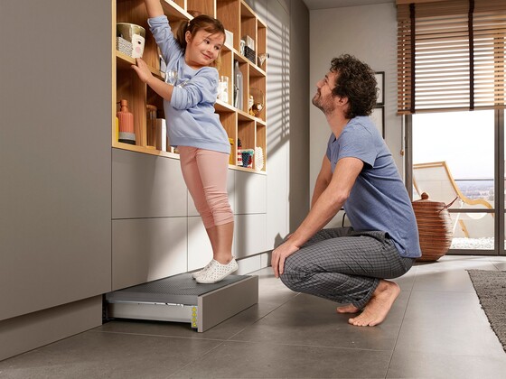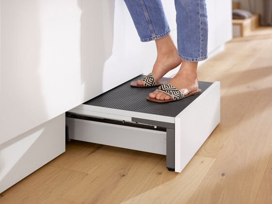 This multifunctional cabinet toe kick offers extra storage space underneath a retractable step.