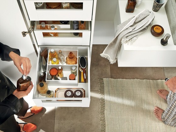 In all areas of the home – kitchen, bathroom, and even the hall – use the storage space available to you to stow baking utensils, toiletries or shoes. You can create clever cabinet applications using the same Blum drawer runners and box systems that you're already familiar with. These storage ideas give you a coherent look that still leaves plenty of design freedom for cabinet interiors.