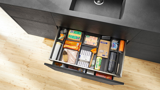 Storage under the sink is essential. This sink cabinet complete with sink drawers makes the most of every available inch, providing easy access to everything inside. It keeps countertops clear and ensures dish washing items are always within reach. Best of all, this solution can be created using standard LEGRABOX, MERIVOBOX and TANDEMBOX components.