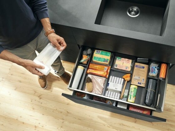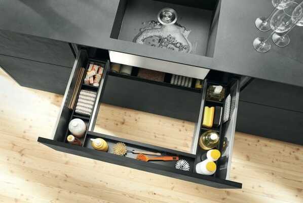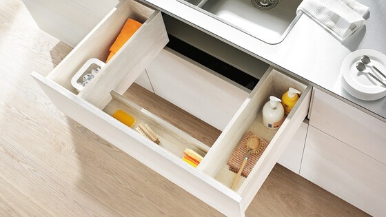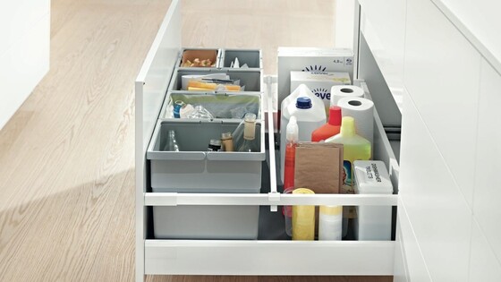 The full extension drawer makes it easy to throw away trash and empty the trash bins. Plus, handy organization systems such as AMBIA-LINE and ORGA-LINE drawer organizers ensure cleaning products are held securely and won't tip over.