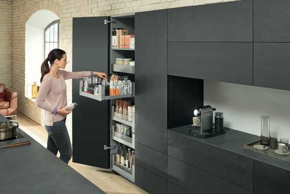 Transform a simple pantry unit into a SPACE TOWER with Blum box systems or drawer runners. Full extension drawers are ideal for making items easily accessible, and SPACE TOWER can be made as wide as needed to maximize storage capacity.