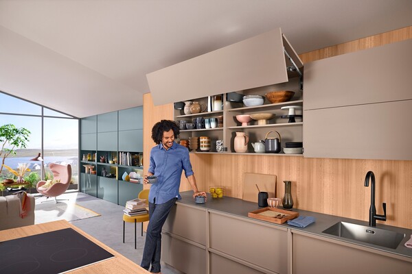 This video shows how the SERVO-DRIVE for AVENTOS top is used to avoid collisions between the fronts of two cabinets that have been installed around a corner.
