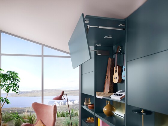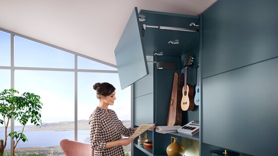 AVENTOS HF top is ideal for taller wall cabinets. It allows you to design large lift systems with two fronts, creating extensive freedom of movement. The bi-fold lift system can also remain open during use.