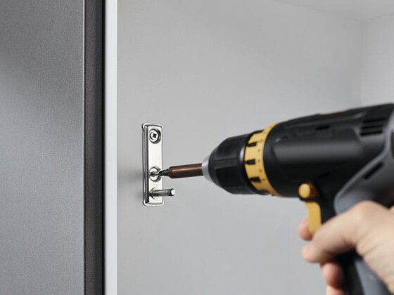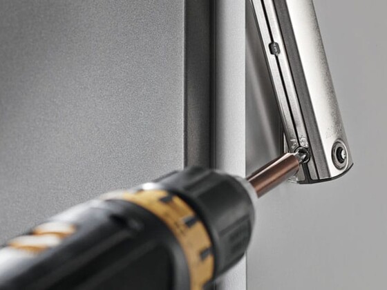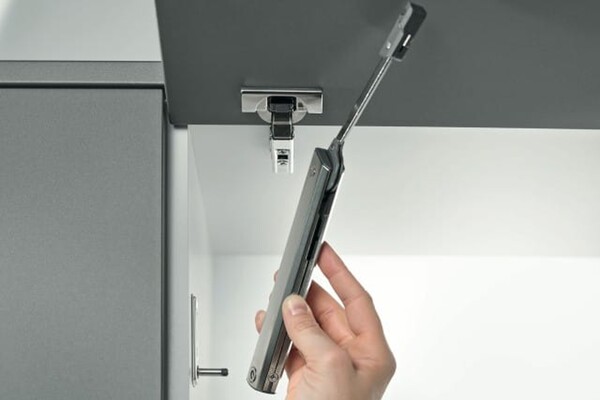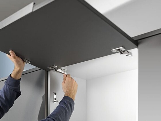 AVENTOS HK-XS components can be assembled easily and virtually tool-free. Once the lift mechanism has been adjusted to the weight and size of the door, AVENTOS HK-XS will always open, close and hold reliably. AVENTOS HK-XS closes silently and effortlessly in combination with CLIP top BLUMOTION, COMPACT CLIP and COMPACT BLUMOTION hinges.