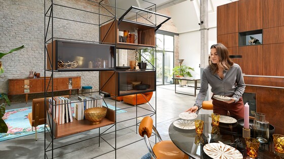 The integrated lift system remains invisible when closed – even with glass fronts. When open, the visible parts of AVENTOS HKi are in an elegant onyx black.