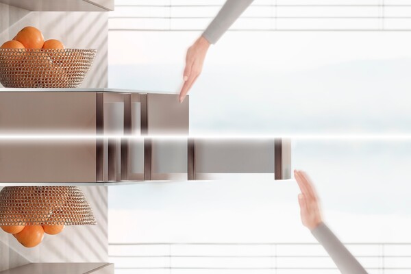 To incorporate handleless fronts in cabinets, simply combine MERIVOBOX with the TIP-ON BLUMOTION mechanical opening support system. This combination is possible thanks to the fully redesigned, innovative L-shaped cabinet profile of MERIVOBOX. Different TIP-ON BLUMOTION units are available to suit different nominal lengths and weight ranges. All other components are universal.