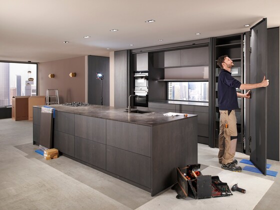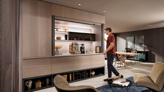 Blum's new product category, pocket systems, opens up completely new opportunities for creating multifunctional space. REVEGO, the unique pocket door system with fully integrated technology, allows you to open up complete living areas when you need them and conceal them again when they are not in use. No matter whether single or double door application, the full overlay fronts disappear into a dedicated narrow cabinet, the pocket.